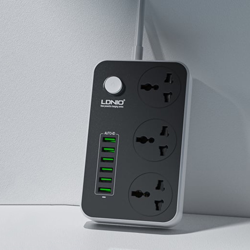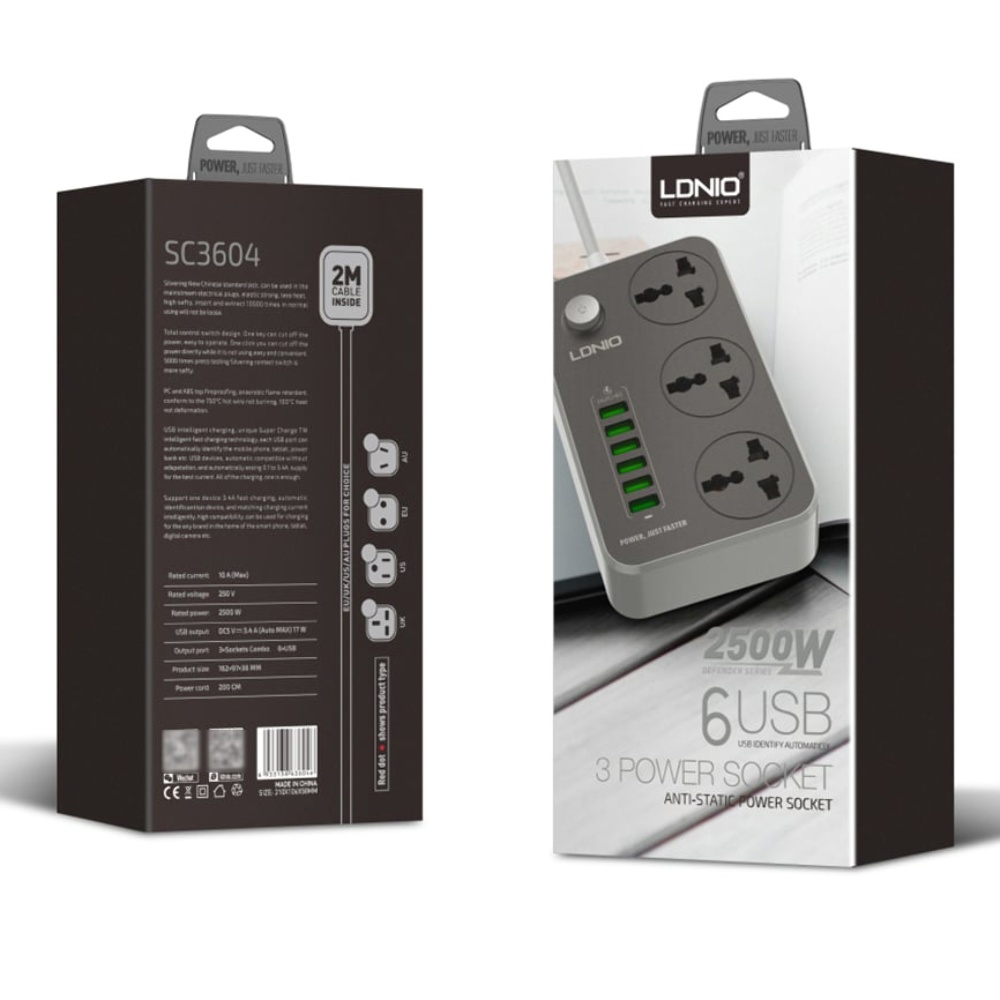 Удлинитель сетевой LDNIO SC3604 6 USB 3 розетки 2m серо-чёрный