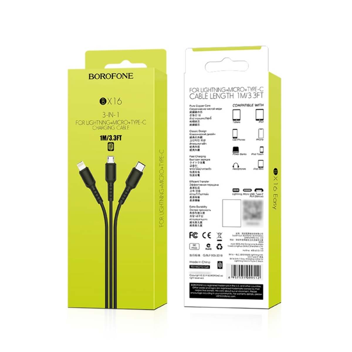 Кабель 3in1 Borofone BX16 Type-C+Micro+Lightning (1м, чорний)