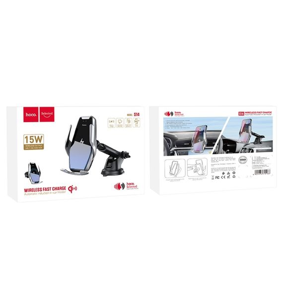 Автотримач HOCO S14 сірий з функцією бездротової зарядки та автоматичним розсувним затискачем
