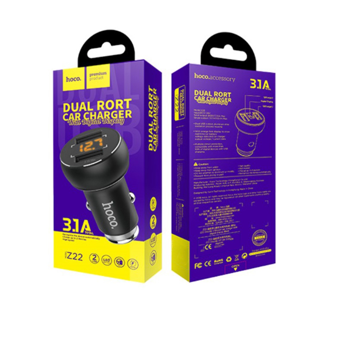Автомобільний зарядний пристрій 2 USB HOCO Z22 2 USB 3.1A чорний з дисплеєм