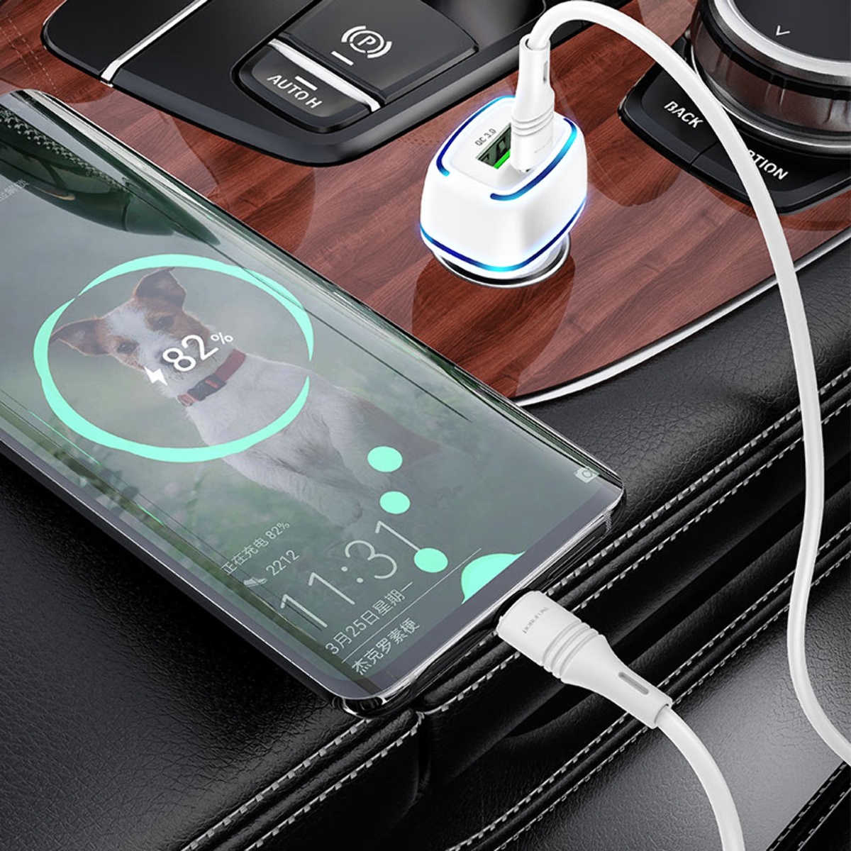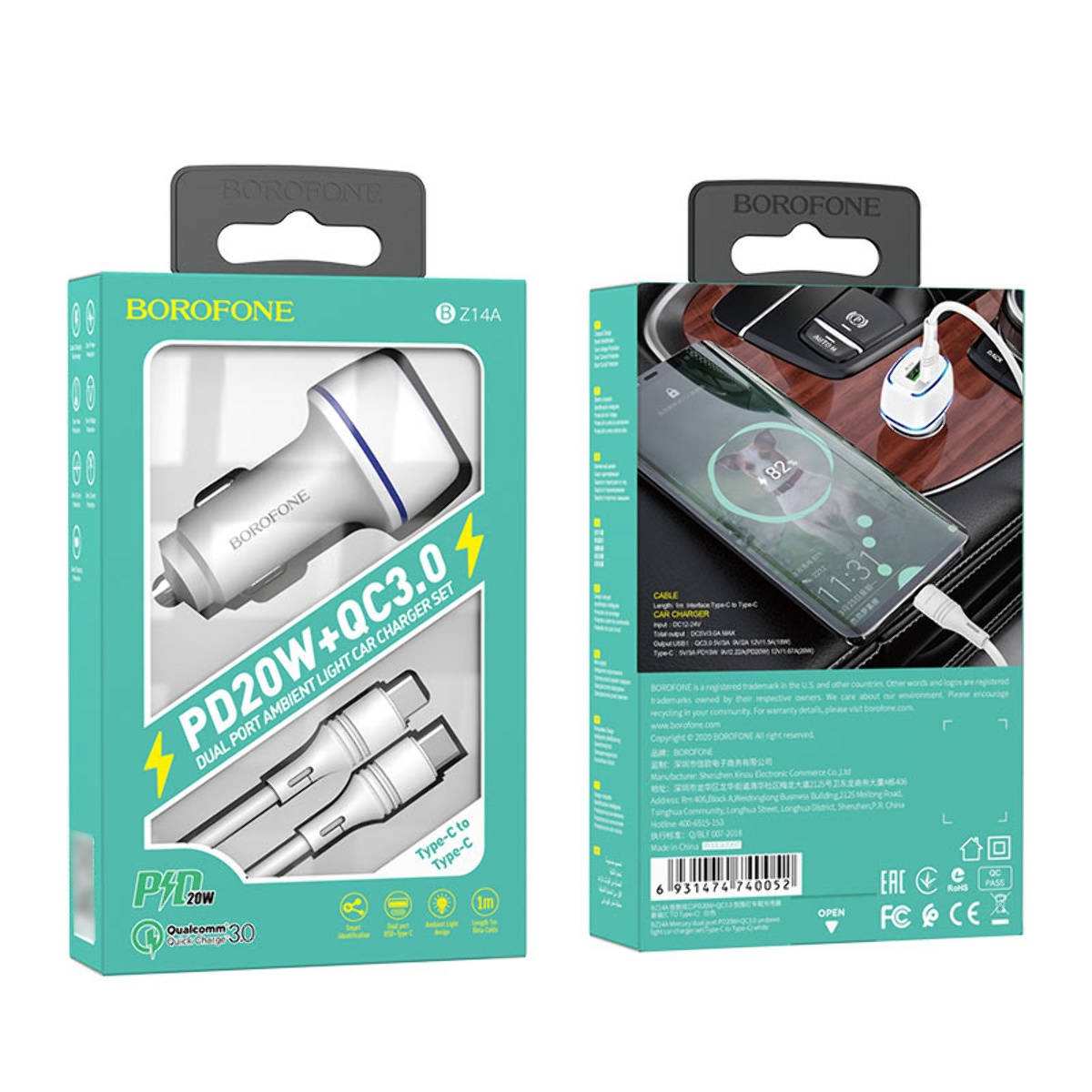 Автомобільний зарядний пристрій 2 USB Borofone BZ14A 1 USB QC+PD 20W Type-C to Type-C білий