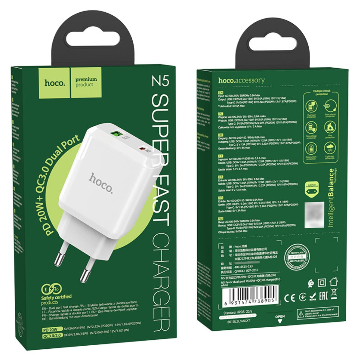 Мережевий зарядний пристрій Hoco N5 PD+QC3.0 у білому виконанні - це надійний та багатофункціональний пристрій для заряджання ваших гаджетів. Завдяки підтримці різних технологій швидкого заряджання, воно забезпечує ефективну і безпечну зарядку ваших пристроїв.