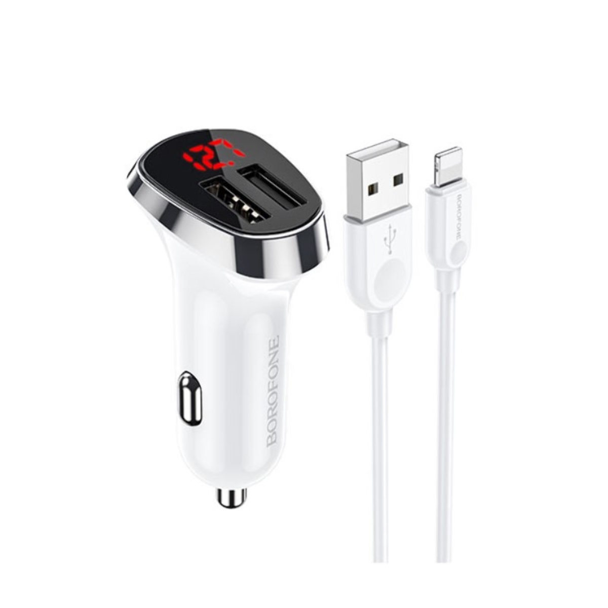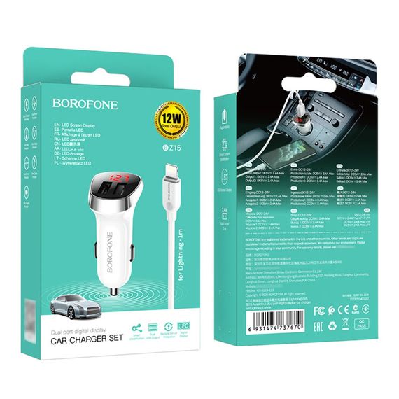 Автомобільний зарядний пристрій 2 USB Borofone BZ15 2 USB 2.4A Lightning з дисплеєм білий