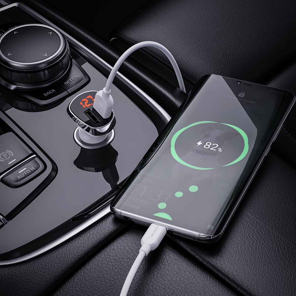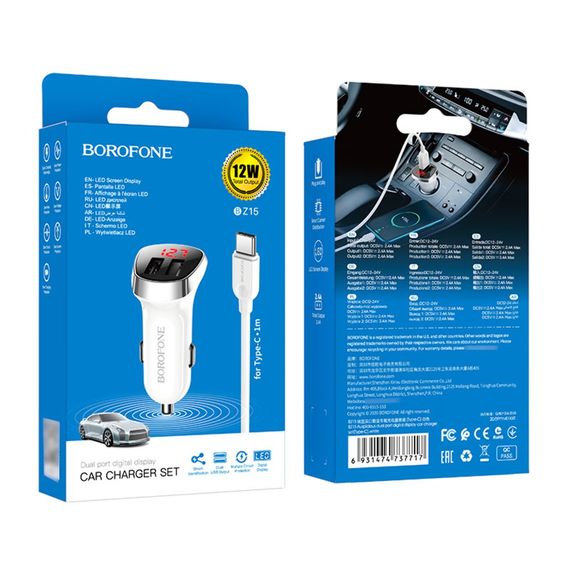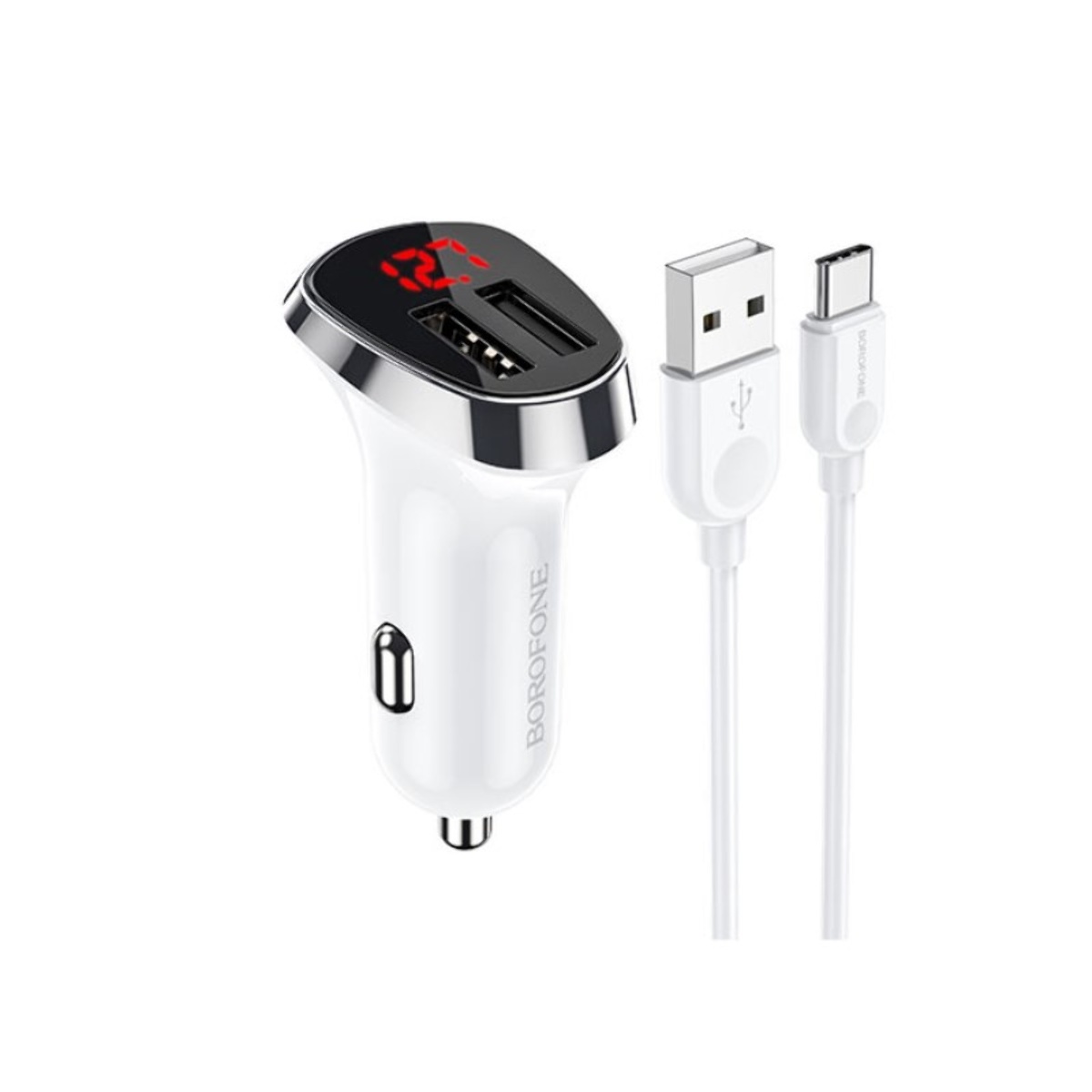 Автомобільний зарядний пристрій 2 USB Borofone BZ15 2 USB 2.4A Type-C з дисплеєм білий