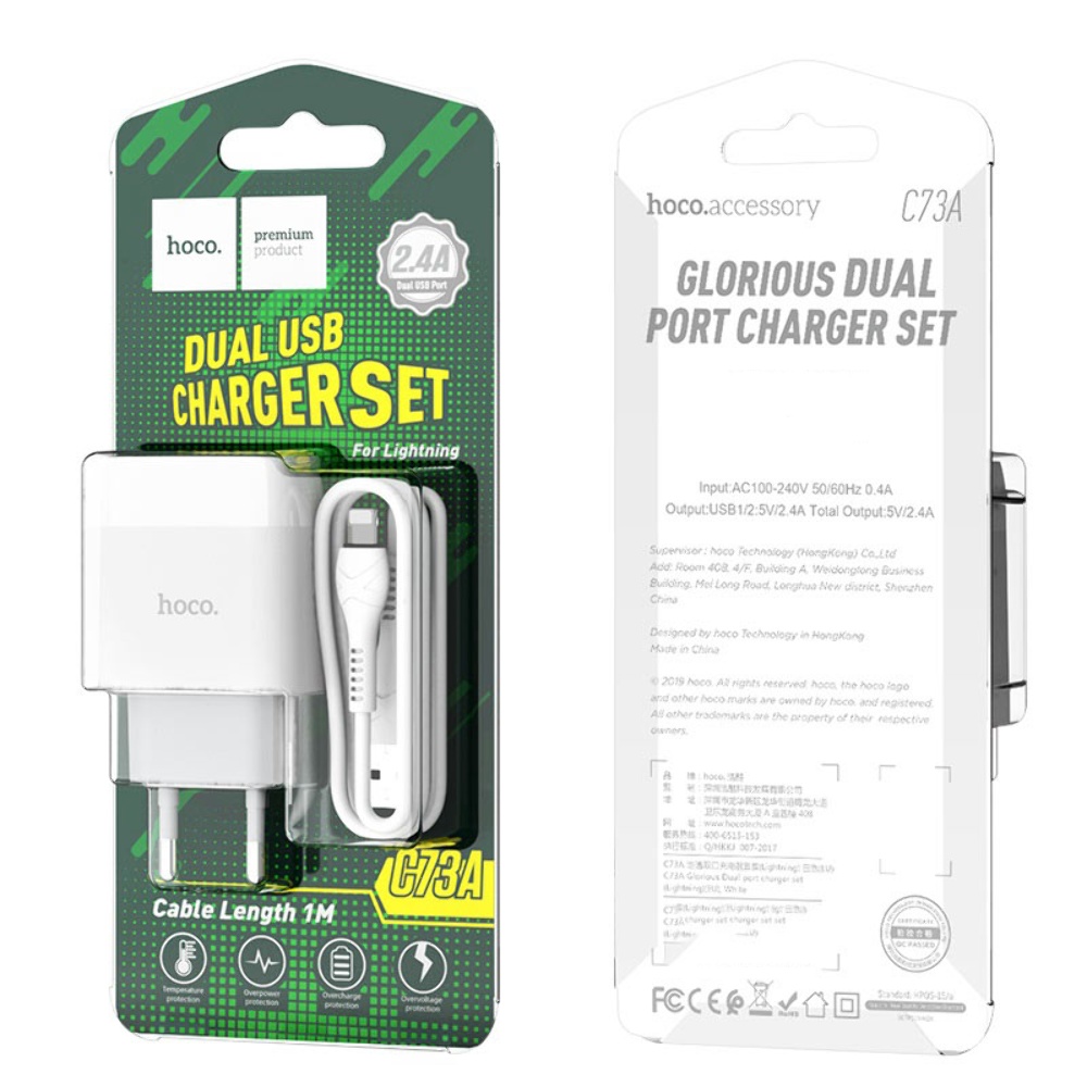Мережевий зарядний пристрій Hoco C73A 2 USB 2.4A Lightning білий