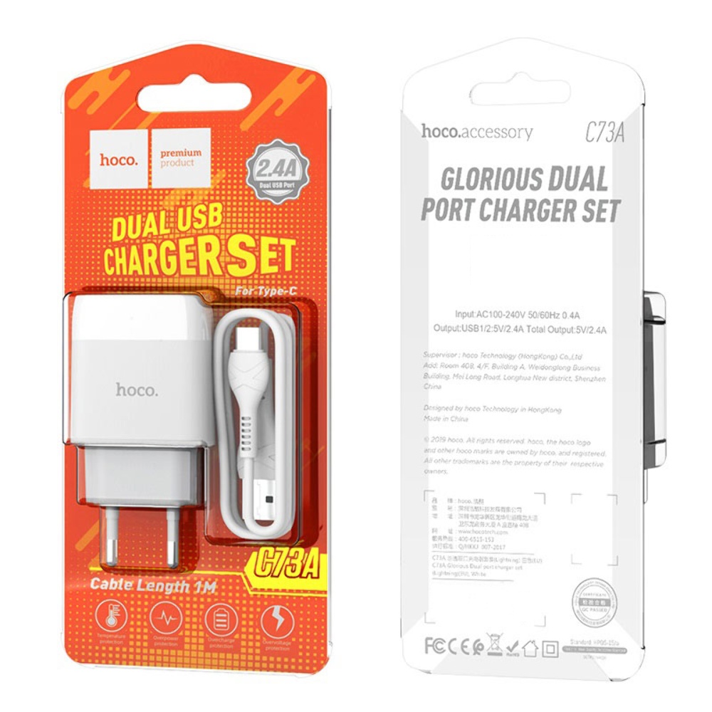 Мережевий зарядний пристрій Hoco C73A 2 USB 2.4A Type-C білий