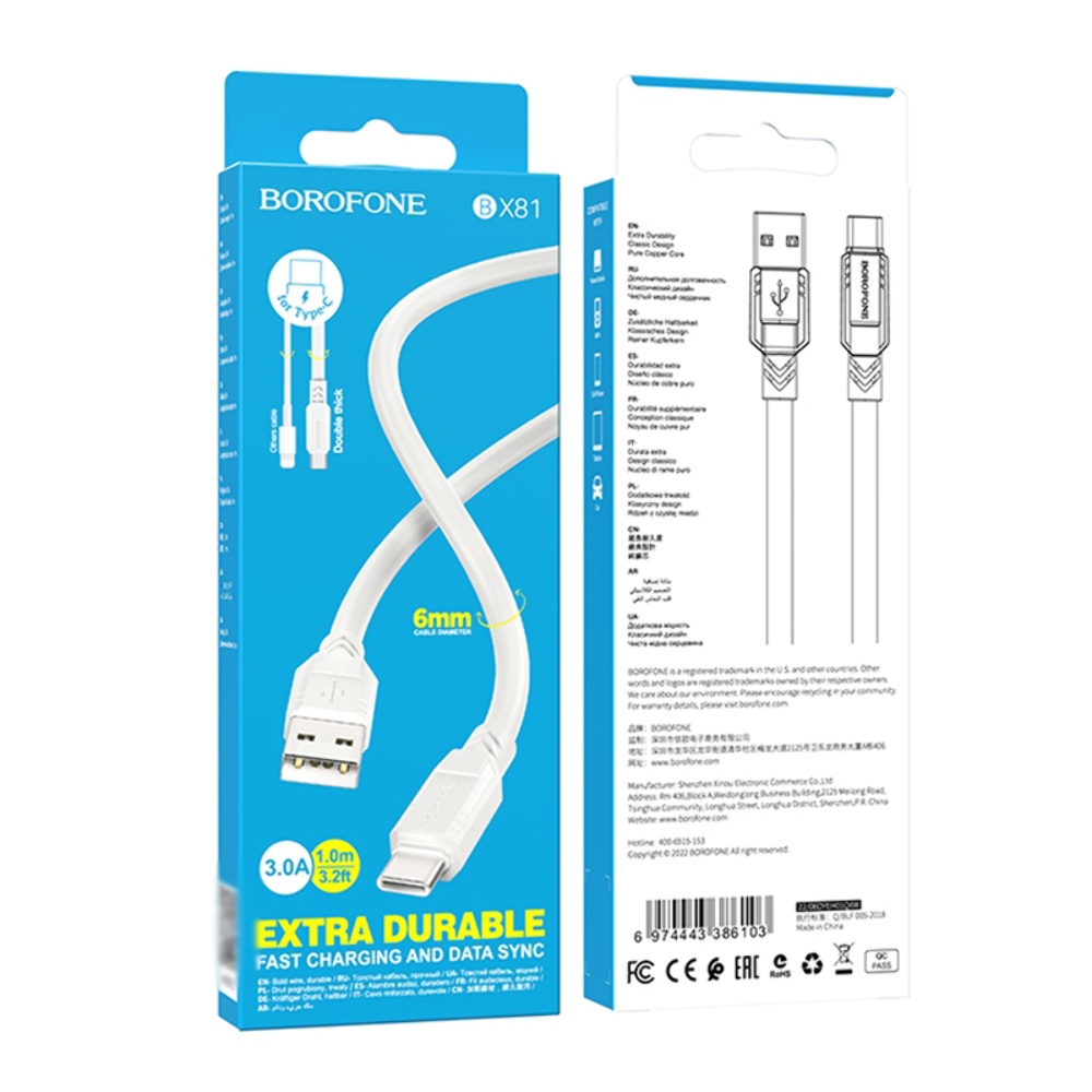 USB кабель Borofone BX81 Type-C 3A 1m білий