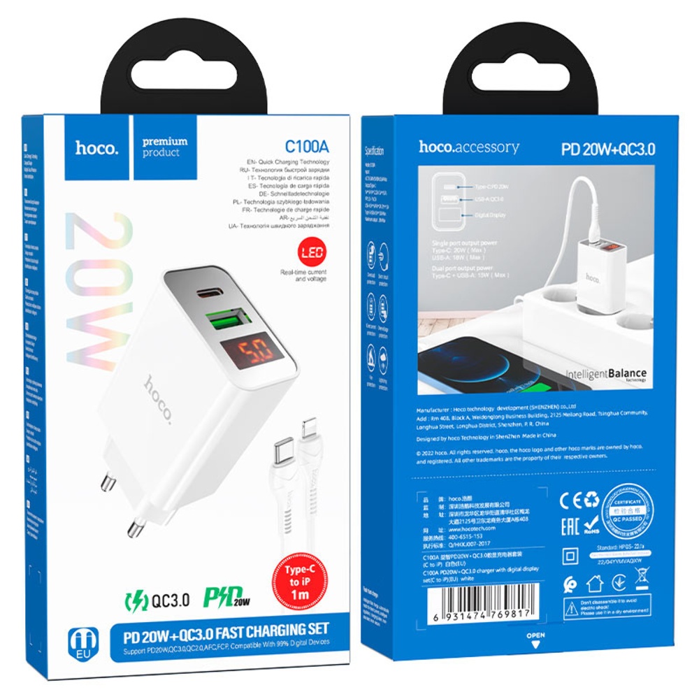 Мережевий зарядний пристрій Hoco C100A PD 20W + QC3.0 Type-C білий + кабель Type-C to Lightning - це потужний та універсальний пристрій для заряджання ваших пристроїв. За допомогою різних стандартів швидкої зарядки, воно надає вам ефективне і безпечне рішення для підтримки заряду ваших гаджетів.