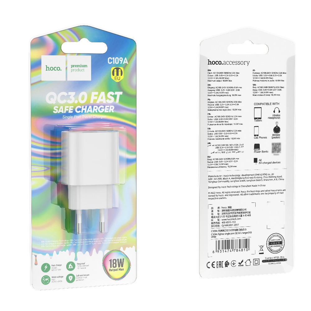 Мережевий зарядний пристрій Hoco C109A у білому кольорі – це компактний та потужний пристрій для швидкого заряджання ваших гаджетів. Виготовлене з вогнестійкого матеріалу PC, воно забезпечує безпеку та надійність у використанні.
