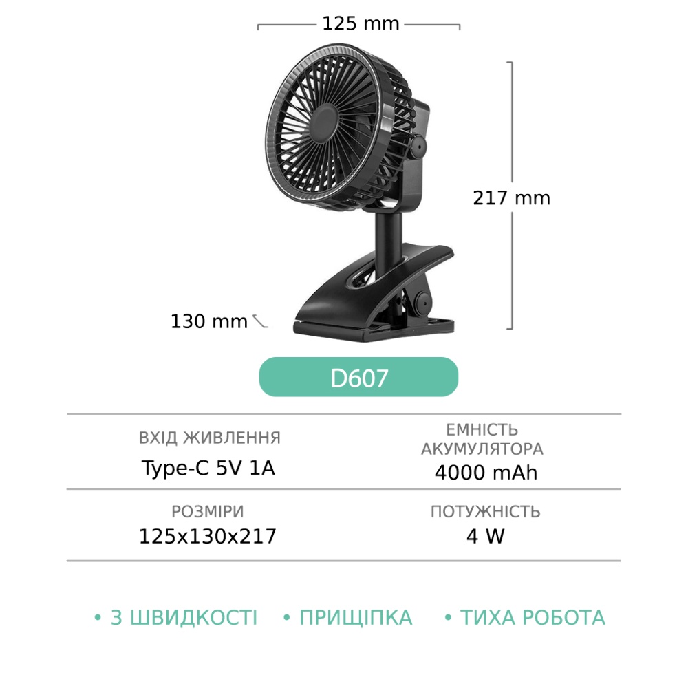 Настільний вентилятор GXQC D607 з прищіпкою темно-сірий