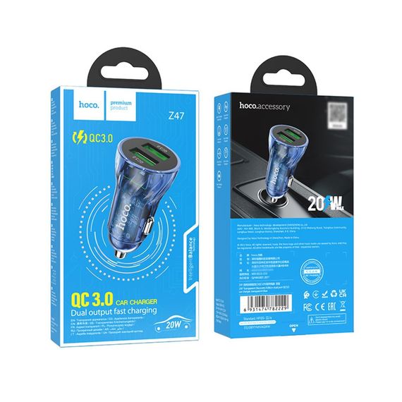 Авто Адаптер Hoco Z47 2 USB QC синьо-чорний