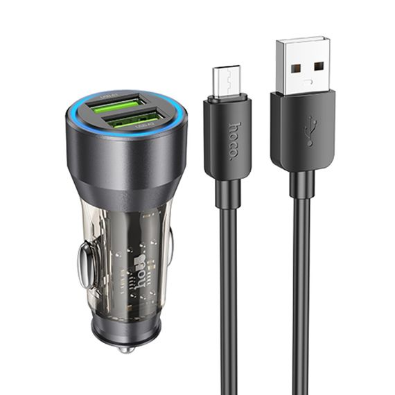 Авто Адаптер Hoco NZ12 2 USB QC 36W transparent black + кабель USB to MicroUSB
