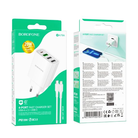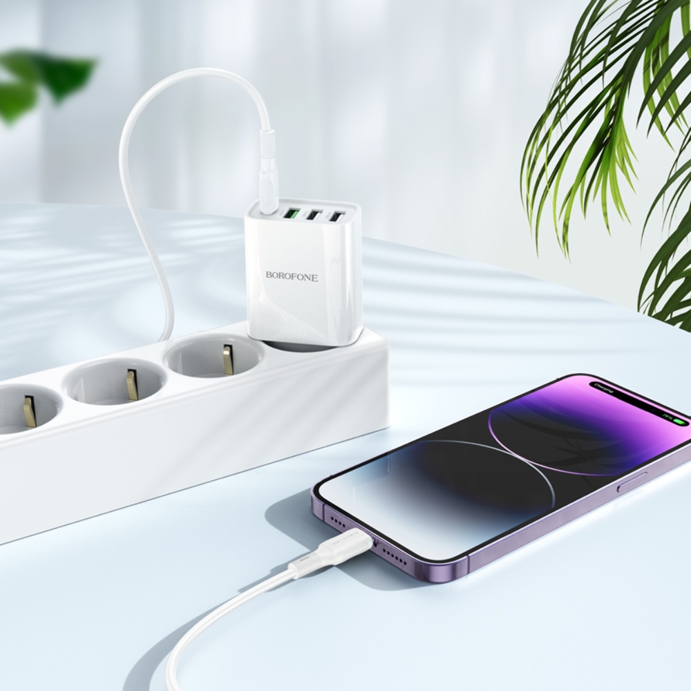 Мережевий зарядний пристрій Borofone BA79A 3 USB/ Type-C 20W білий + кабель Type-C to Lightning
