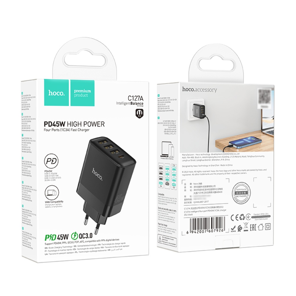 Мережевий зарядний пристрій Hoco C127A 3 USB/ Type-C PD45W чорний