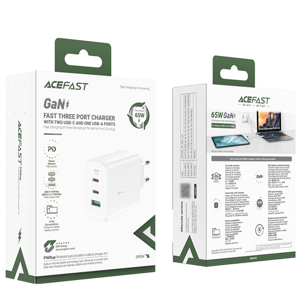 Сетевое зарядное устройство ACEFAST A41 USB/ 2 Type-C QC PD PD 65W GaN белое