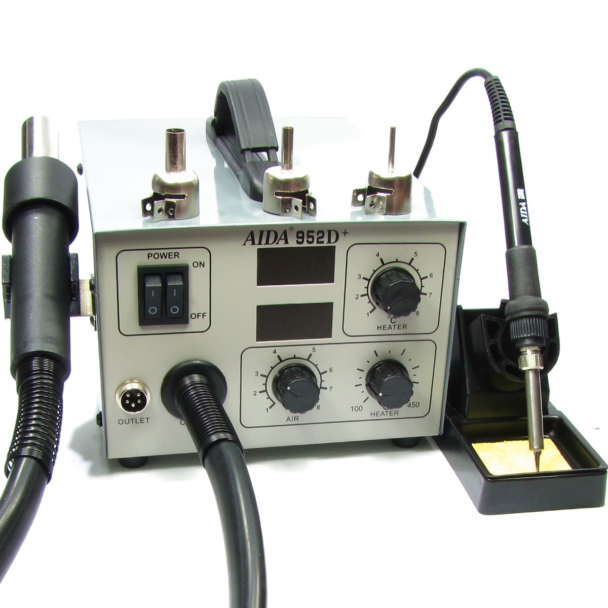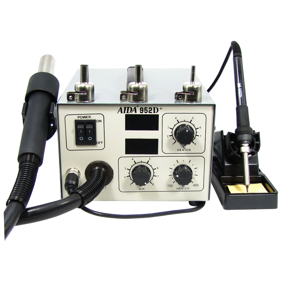 Паяльна станція Aida 952D+, фен з вентиляторним нагнітачем, вбудованим у корпус блоку управління, паяльник