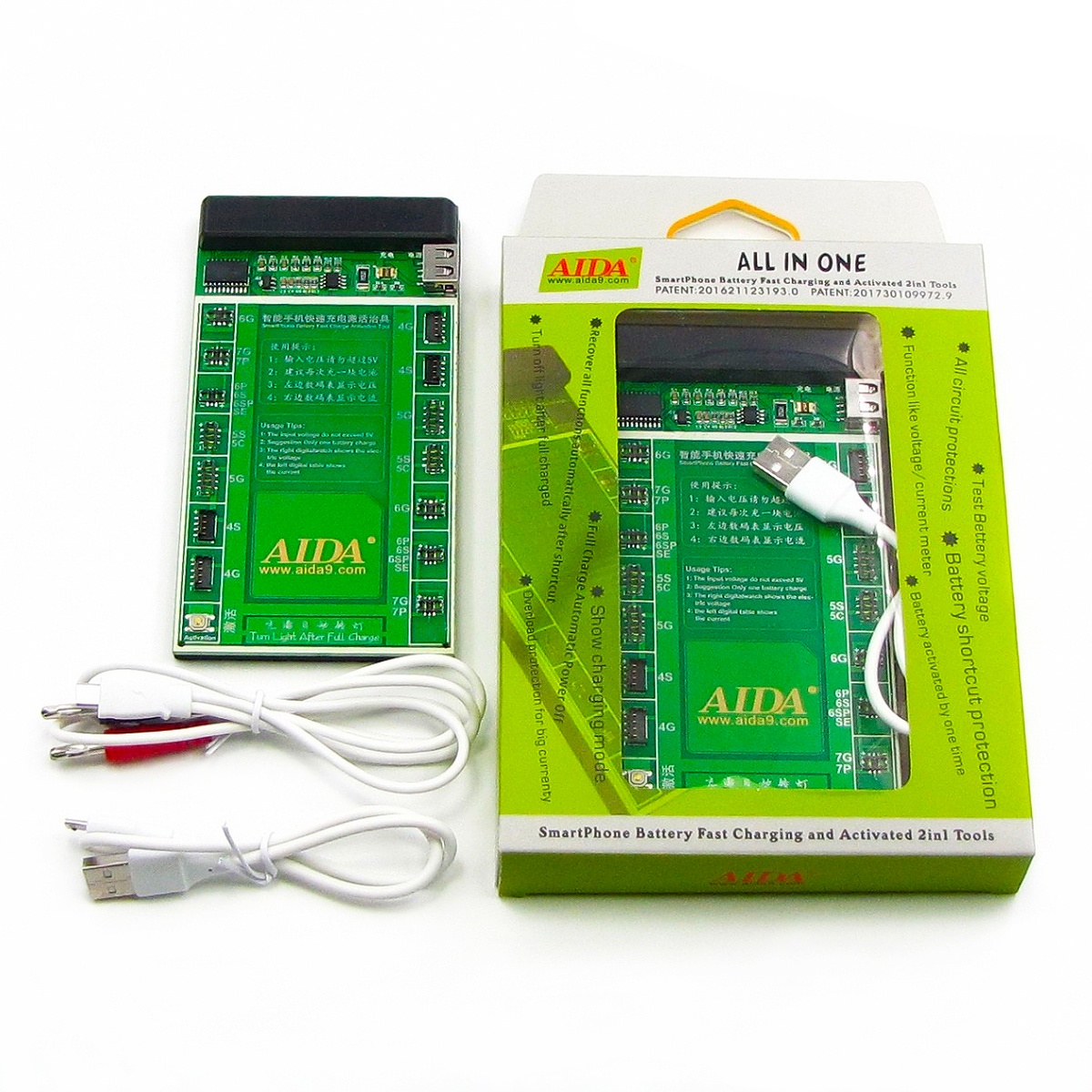 Плата активації та заряджання акумуляторів Aida A-600 з цифр. інд. (4G/4S/5G/5S/6G/6P/6S/6SP/SE/7G/7P; кабелі microUSB/USB A, microUSB/ штекери БЖ)