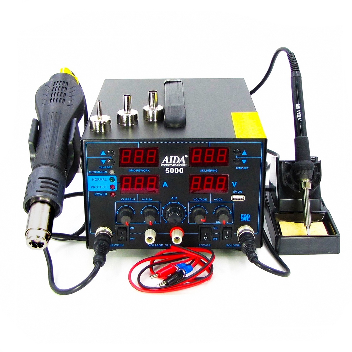 Паяльна станція Aida 5000 фен, паяльник, блок живлення 30V 5A, USB A 5V 2A, цифрова індикація