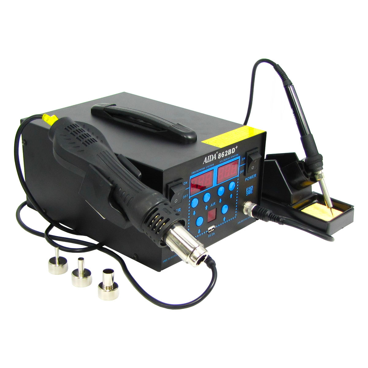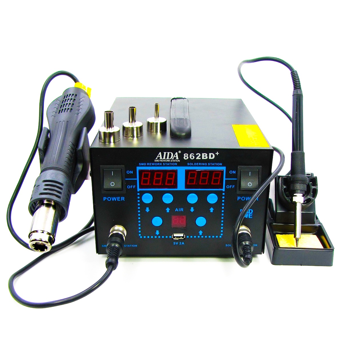 Паяльна станція Aida 862BD+ фен, паяльник, індикація потужності подачі повітря, USB A 5V 2A, цифрова індикація