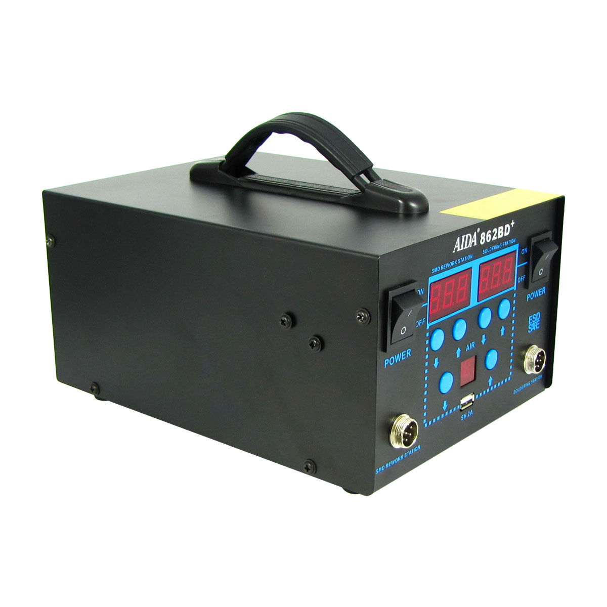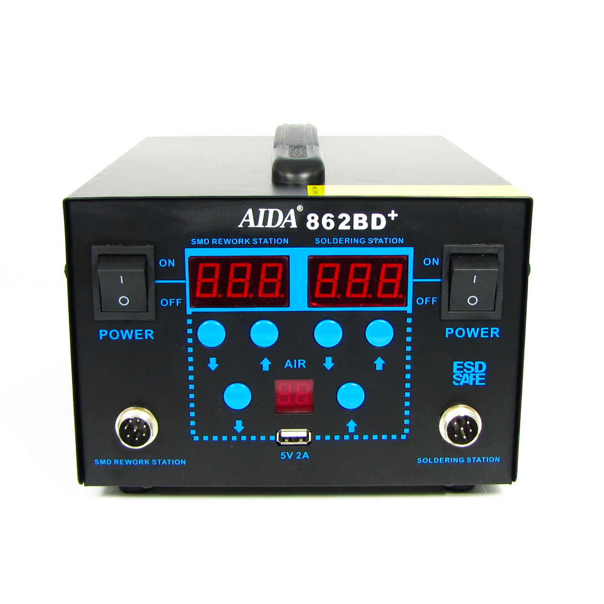 Aida 862BD+ - це паяльна станція для паяння SMD, BGA компонентів та багато іншого. На лицьовій панелі паяльної станції ми бачимо 3 LED дисплеї, 2 з них відповідають за індикацію температури, третій відображає подачу повітря. Для підлаштування температури та подачі повітря використовуються механічні кнопки, поруч розташовані клавіші вимкнення та відключення.