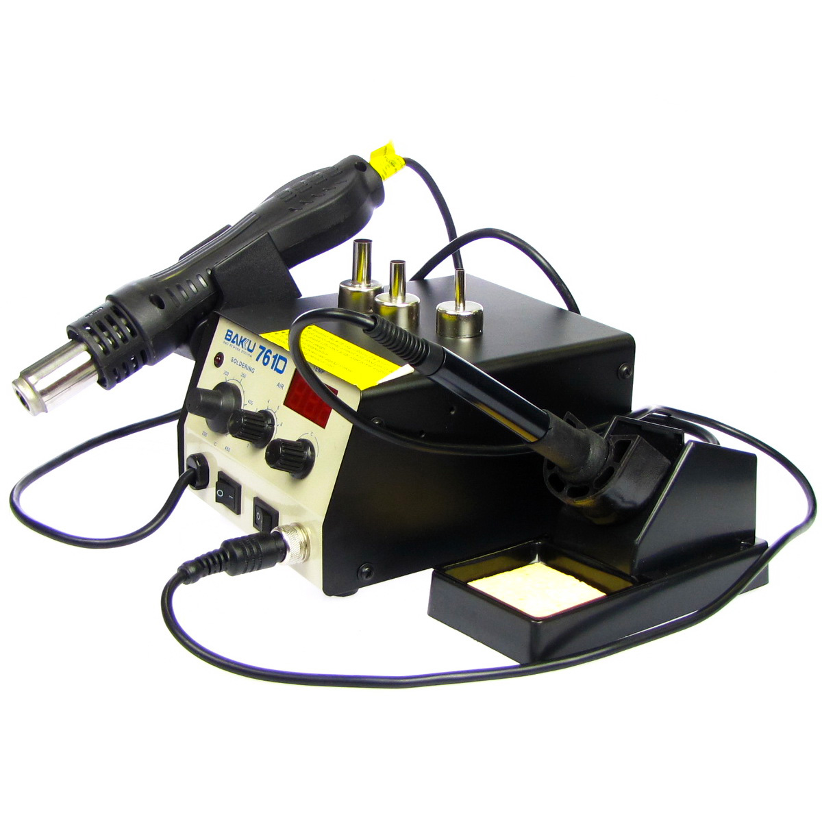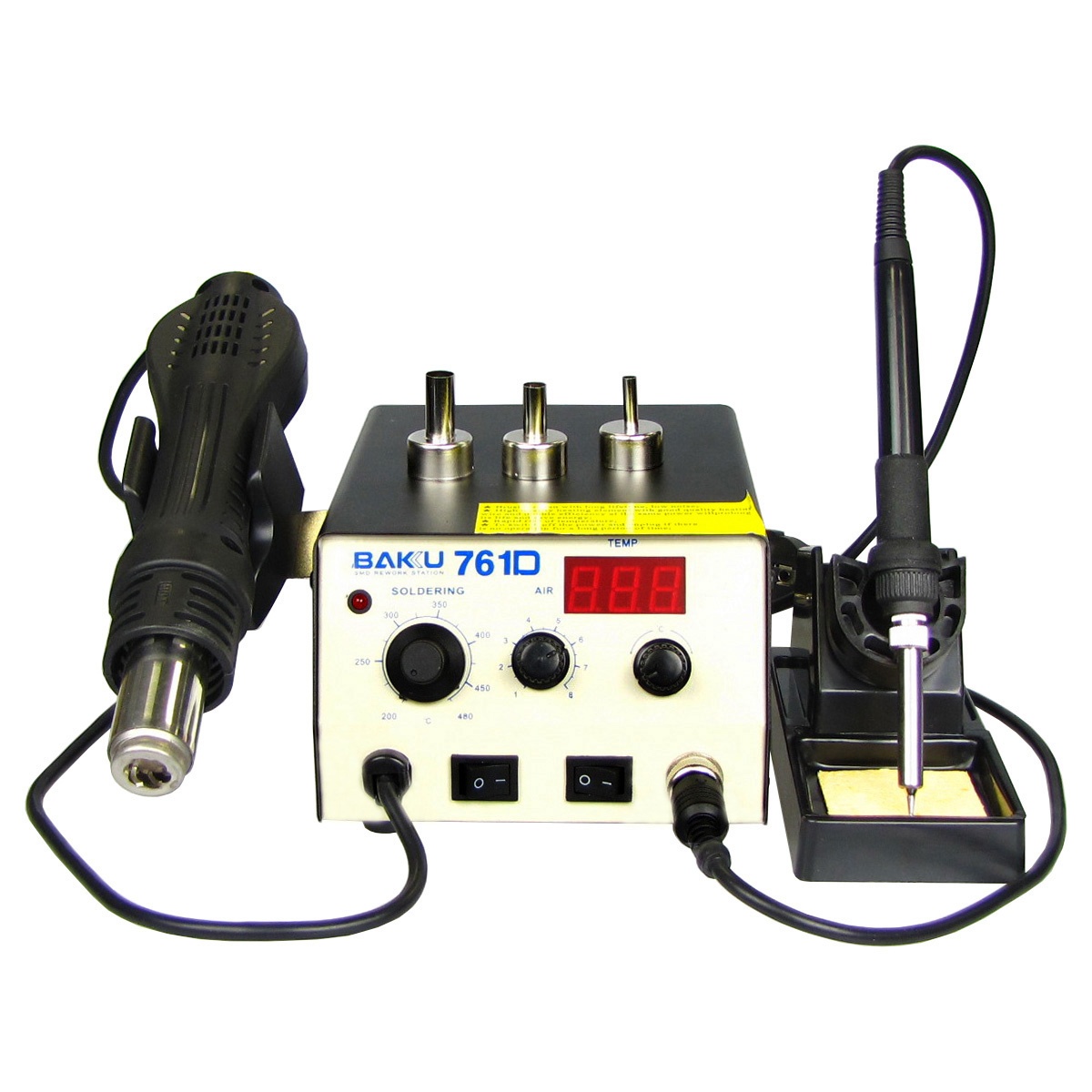Baku BK761D - це паяльна станція, що включає паяльник і термофен. Станція має цифровий екран для відображення температури термофена, підстроювання температури паяльника виконується за допомогою механічного регулятора. Безперечним плюсом є простота використання, мобільність, універсальність жала паяльника тип 900M.