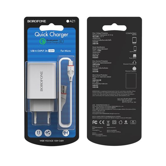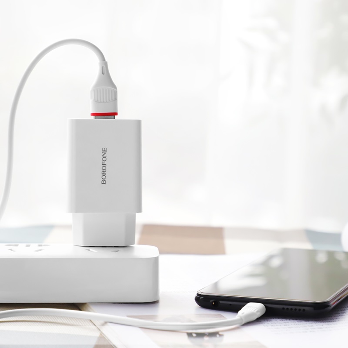 Адаптер USB Borofone BA21A QC 3.0 18W +Micro білий